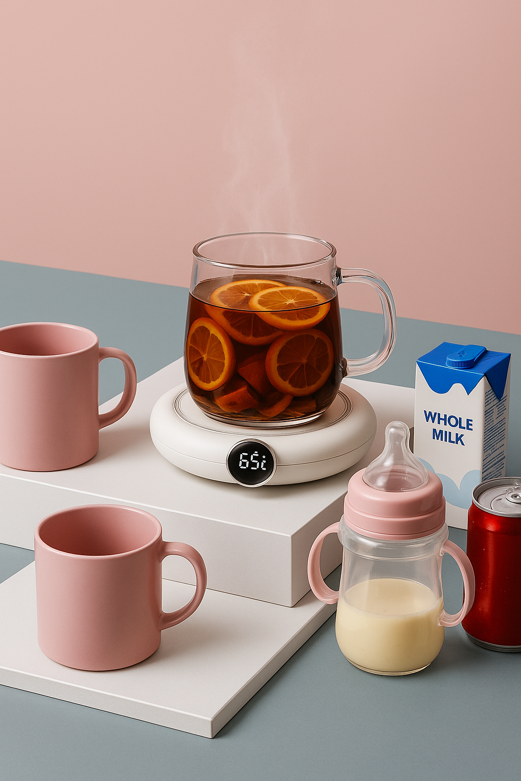 Any flat-bottomed mug, cup, or bottle works perfectly for optimal heating.